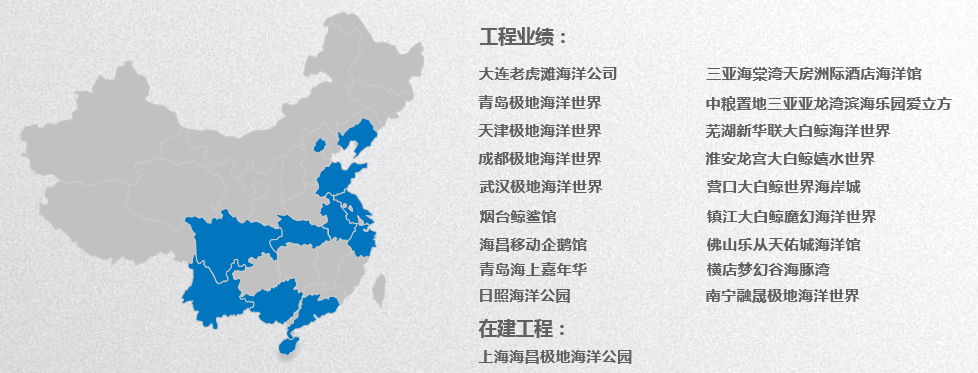 大連凱晨已完成了大連老虎灘極地海洋世界、青島極地海洋世界、青島鯨豚館、成都極地海洋世界、天津極地海洋世界、煙臺(tái)鯨鯊館、武漢極地海洋世界等項(xiàng)目維生系統(tǒng)設(shè)計(jì)建造任務(wù)。